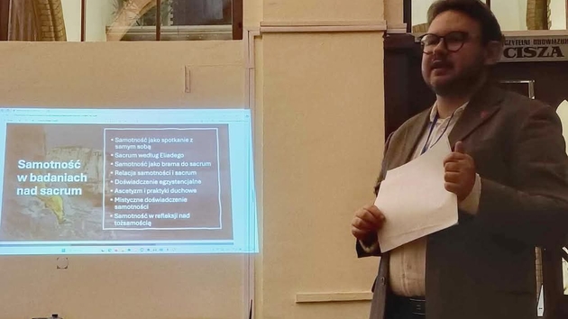 Kamil zaprezentował referat pt. „Relinquum sacrum. Etnograficzne spojrzenie na krajobraz kultury religijnej w XXI wieku”, w którym przedstawił wyniki swoich badań oraz wnioski z pracy licencjackiej.