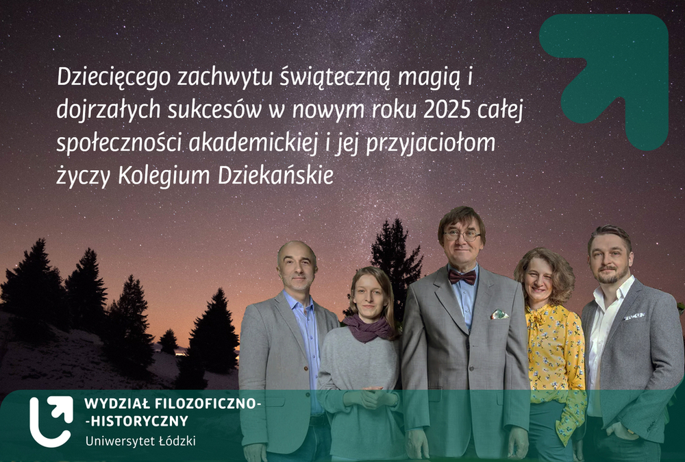 „Dziecięcego zachwytu świąteczną magią i dojrzałych sukcesów w nowym roku 2025 całej społeczności akademickiej i jej przyjaciołom życzy Kolegium Dziekańskie Wydziału Filozoficzno – Historycznego