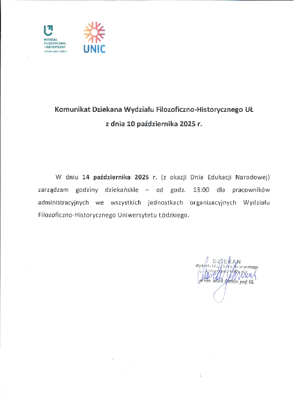 Zarządzenie nr 14/2025 Dziekana Wydziału Filozoficzno-Historycznego UŁ z dnia 15 października 2025 r. w sprawie: dnia dziekańskiego na Wydziale Filozoficzno-Historycznym Uniwersytetu Łódzkiego w dniu 10 listopada 2025 r.