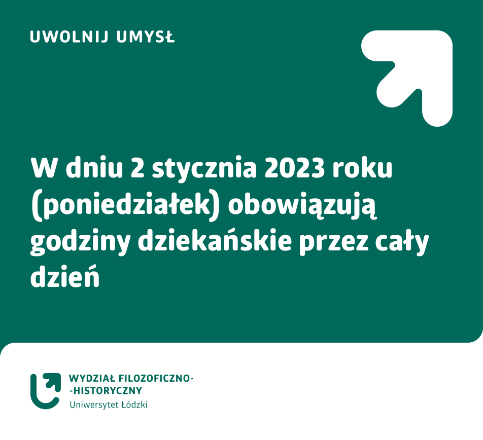 Zgodnie z decyzją Pana Dziekana WFH UŁ prof. M. Kokoszko, dzień 2 stycznia (poniedziałek) 2023 roku jest dniem dziekańskim wolnym od zajęć akademickich.