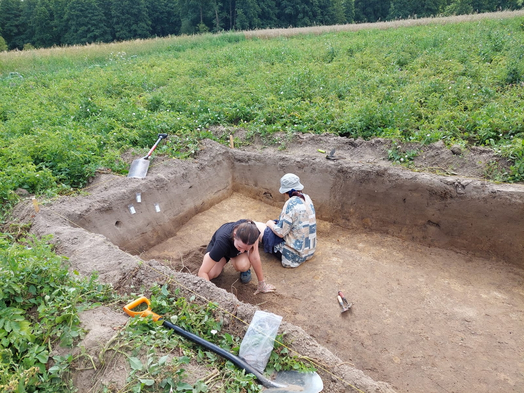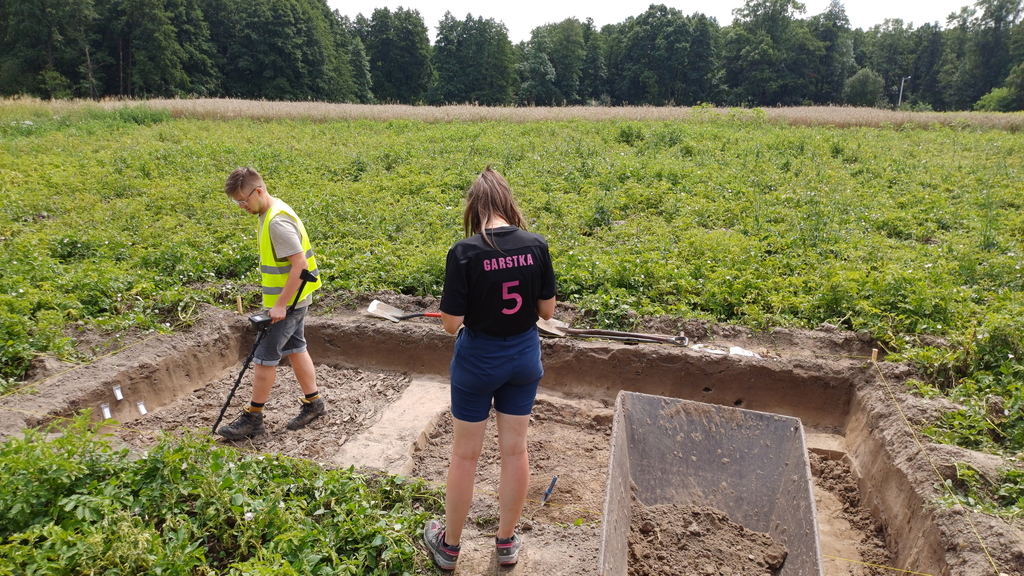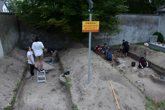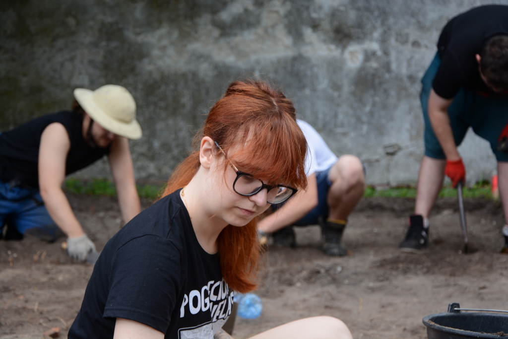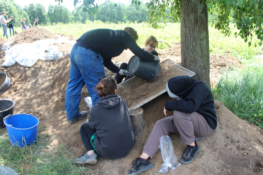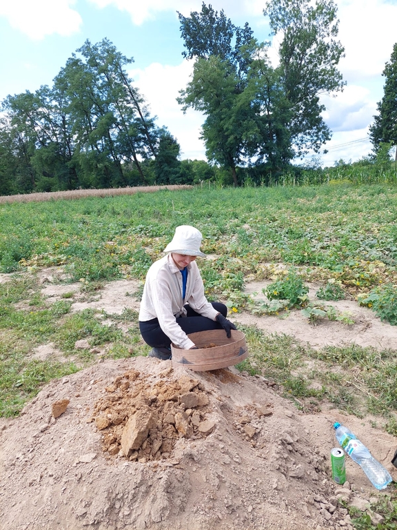 Podobnie jak w poprzednich sezonach badawczych nasi studenci uczestniczyli rotacyjnie w pracach terenowych na obydwu stanowiskach archeologicznych. W Staromieściu zdobywali wykopaliskowe doświadczenia pod okiem mgr Anny Garstki na południowy-zachód od kościoła Wniebowzięcia NMP, którego historia sięga XII w. Wyniki dotychczasowych badań przeprowadzonych z drugiej strony kościoła w latach 2022–2023 przez mgr. Radosława Zdaniewicza pozwoliły potwierdzić oraz jednocześnie rozpoznać północno-wschodni skraj oraz północno-zachodni obszar osady wczesnośredniowiecznej. W wyniku tych prac archeologicznych natrafiono m. in. na relikty pieca, ołowiane odważniki, srebrne monety, w tym denar Władysława Wygnańca z 1. poł. XII w., wczesnośredniowieczną ostrogę z piramidalnym, pozłacanym bodźcem oraz dużą liczbę fragmentów ceramiki naczyniowej używanej w okresie wczesnego i późnego średniowiecza oraz w czasach nowożytnych.