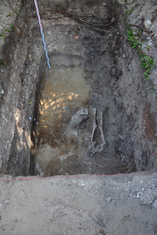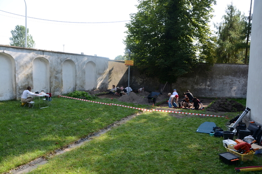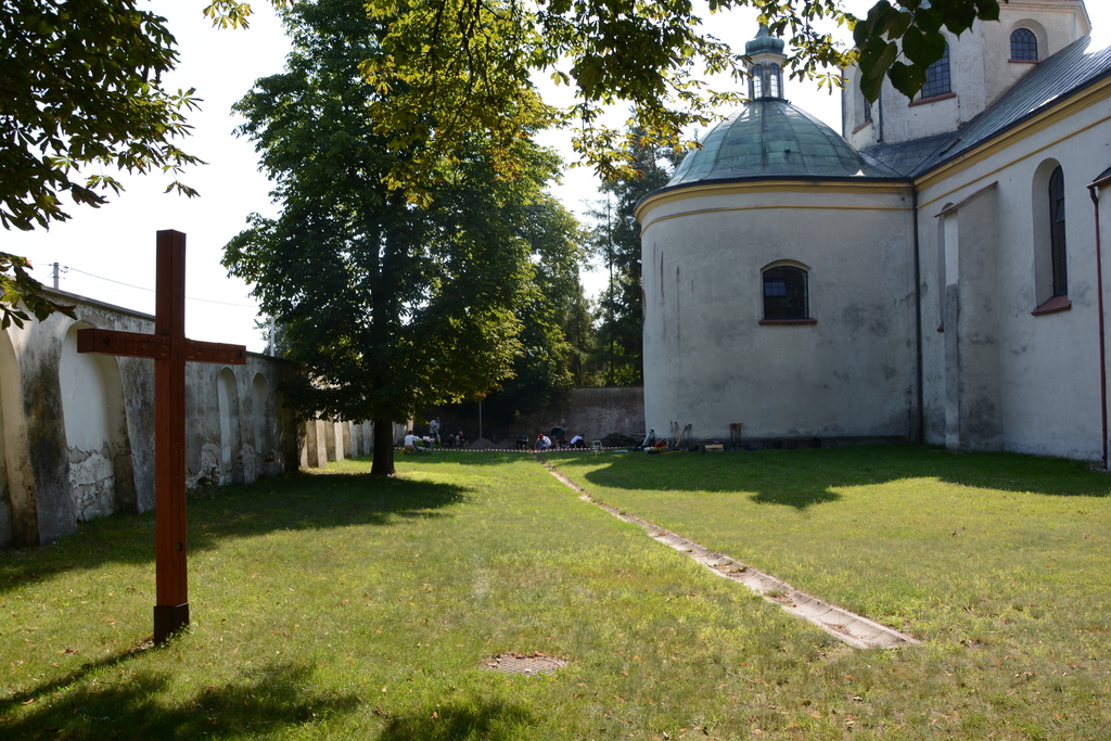 Celem tegorocznych badań było zweryfikowanie tej hipotezy w odniesieniu do terenu sąsiadującego ze współczesnym upamiętnieniem polskiego żołnierza od strony północnej, w taki sposób, by nie ingerować w strukturę i bezpośrednie otoczenie istniejącego grobu wojennego. W założonych dwóch wykopach sondażowych zadokumentowano poziom nowożytnego cmentarza przykościelnego, na terenie którego – zgodnie z księgami metrykalnymi parafii św. Doroty w Przyrowie – przeprowadzane były incydentalne pochówki w ciągu XVIII w. Łącznie odkryto szczątki co najmniej 9 osobników obu płci (dorosłych i dzieci), przy czym 6 z nich odkryto w układzie pierwotnym, nienaruszonym lub częściowo naruszonym przez późniejsze wkopy. Szczątki te nie były podejmowane. Kości ludzkie, które znajdowały się na wtórnym złożu, po zadokumentowaniu, zostały ponownie uroczyście pochowane przez o. Wojciecha Ożoga, kapelana klasztoru.