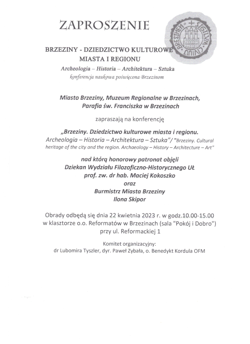 BRZEZINY. Dziedzictwo kulturowe miasta i regionu. Archeologia – historia – architektura – sztuka , która odbędzie się w dniu 22 kwietnia 2023 roku w murach klasztoru o.o. Reformatorów w Brzezinach.