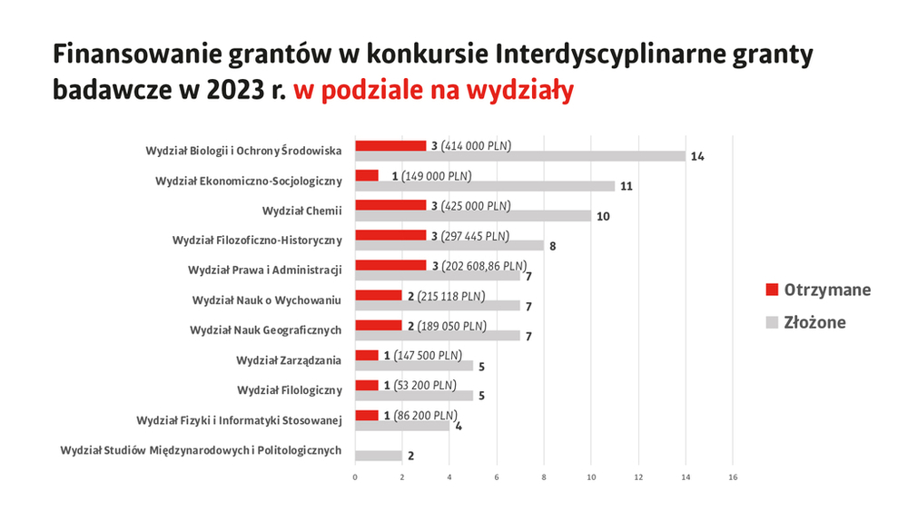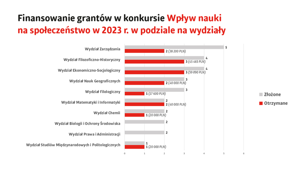 Wydział Studiów Międzynarodowych i Politologicznych – grantów złożonych 1, grantów otrzymanych 1, łączna otrzymana kwota to: 20 000 zł.