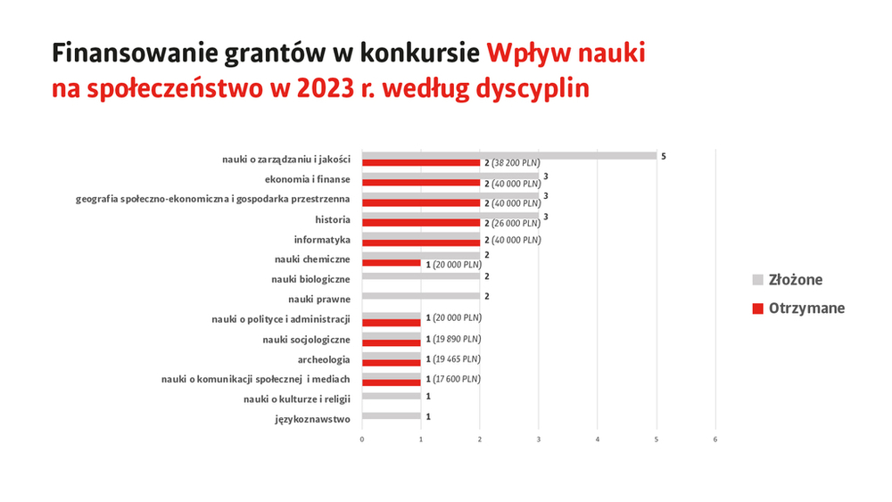 nauki o polityce i administracji – grantów złożonych 1, grantów otrzymanych 1, łączna otrzymana kwota to: 20 000 zł;