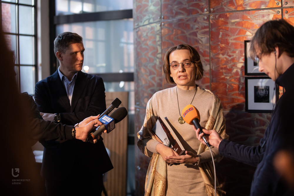 Grupa osób udziela wywiadu dziennikarzomTematem przewodnim spotkania była współpraca UŁ z otoczeniem. Byli z nami m.in: dr Agnieszka Rzeńca z Wydziału Ekonomiczno-Socjologicznego UŁ, prof. Ewa Kołodziejczyk z PAN (laureatka II edycji Nagrody im. Prof. T. Kotarbińskiego) oraz Viktoria Wieczorek, studentka z SKN Inwestor.