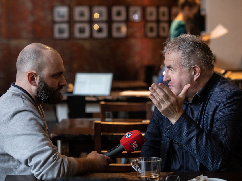 Mężczyzna udziela wywiadu dziennikarzowi z mikrofonemO zagrożeniach ekologicznych czekajacych nasze i przyszłe pokolenia mówił prof. Tomasz Jurczak z Wydziału Biologii i Ochrony Środowiska.