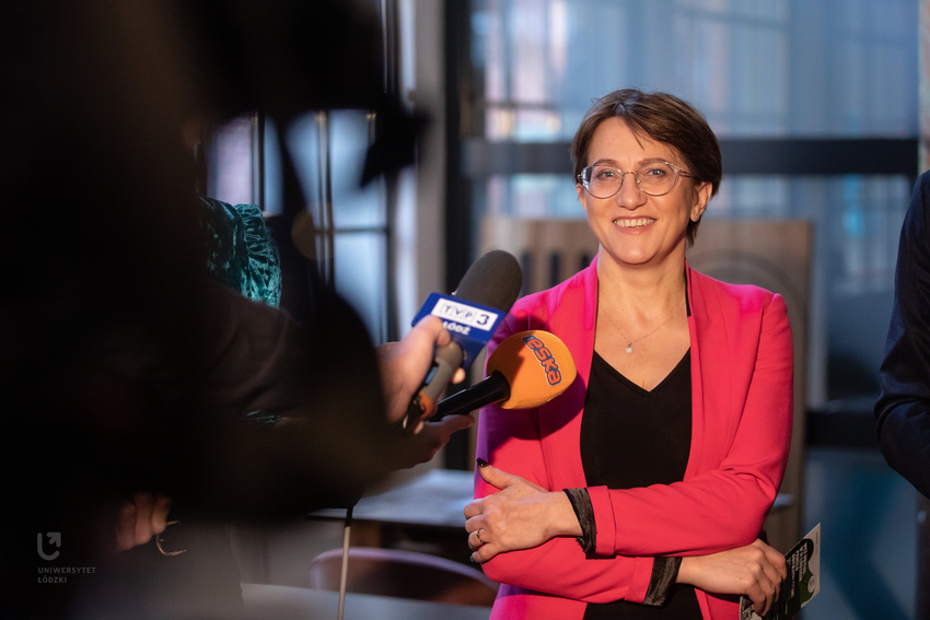 Kobieta w różowej marynarce przed kamerą mówi do mikrofonówDr Agnieszka Rzeńca z Wydziału Ekonomiczno-Socjologicznego opowiedziała o założeniach II Łódzkiego Panelu Obywatelskiego.