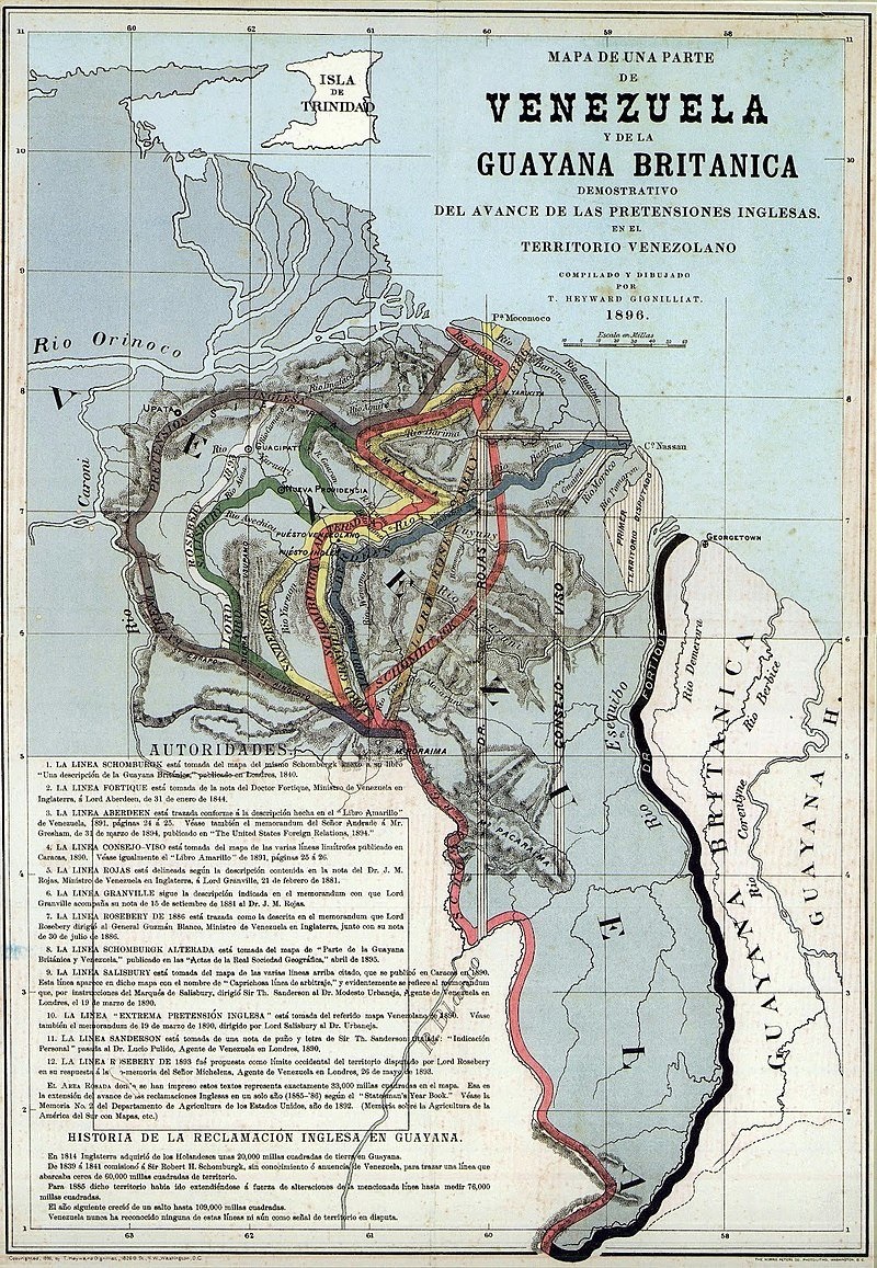 Wenezuela zakwestionowała ustalenia "linii Schomburgka", uważając, że w ten sposób Wielka Brytania nielegalnie nabyła obszar ok. 80 000 km2 prowincji Esequibo do którego roszczenia zgłaszała Wenezuela. W 1886 roku obydwa państwa zerwały ze sobą stosunki dyplomatyczne, a Wenezuela poprosiła o protekcję Stany Zjednoczone.