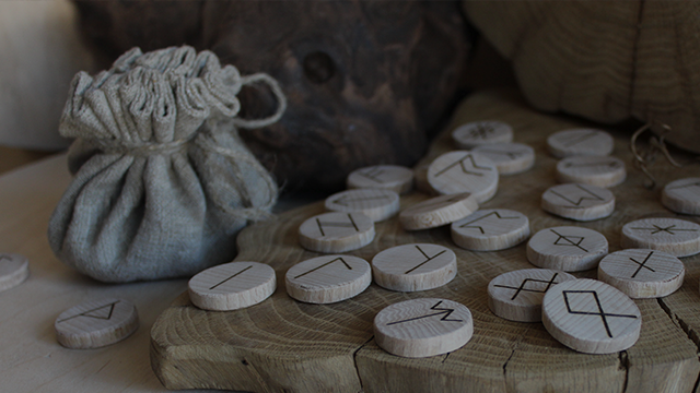 Worek, wokół którego leżą drewniane klocki z napisanymi znakami wikingów