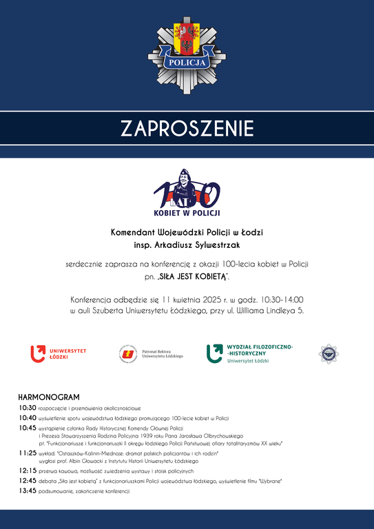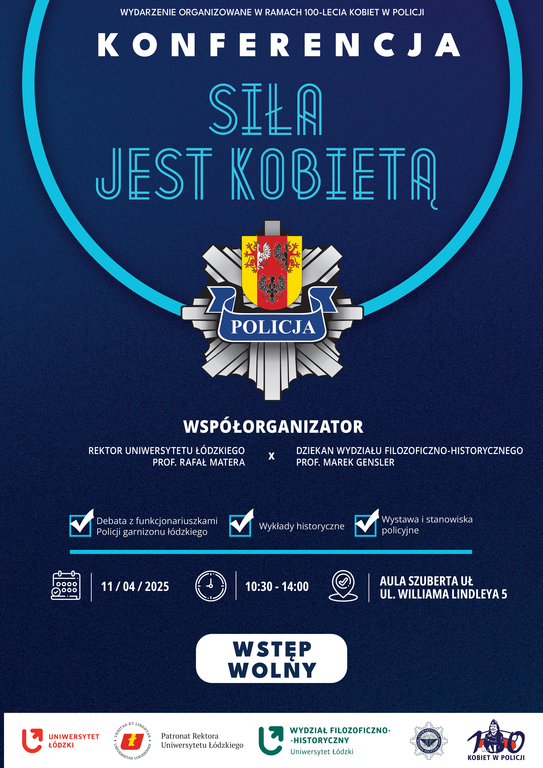 Z okazji obchodów 85. rocznicy Zbrodni Katyńskiej oraz 100-lecia obecności kobiet w Policji, serdecznie zapraszamy na wyjątkową konferencję „Siła jest kobietą”. Wydarzenie organizowane jest przez Wydział Komunikacji Społecznej KW Policji w Łodzi przy udziale Wydziału Filozoficzno-Historycznego UŁ oraz Uniwersytetu Łódzkiego. Konferencja odbędzie się 11 kwietnia 2025 roku, o godzinie 10:30, w Auli Profesora Wacława Szuberta przy ul. Williama H. Lindleya 5 w Łodzi. Wstęp na konferencję jest bezpłatny.